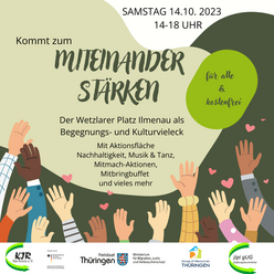 Der Kreisjugendring Ilm-Kreis e.V. und Partner laden auf den Wetzlarer Platz als 'Begegnungs- und Kulturvieleck' zum Fest mit einer Aktionsfläche Nachhaltigkeit, Musik & Tanz, Mitmach-Aktionen, Mitbringbuffet u.v.m.