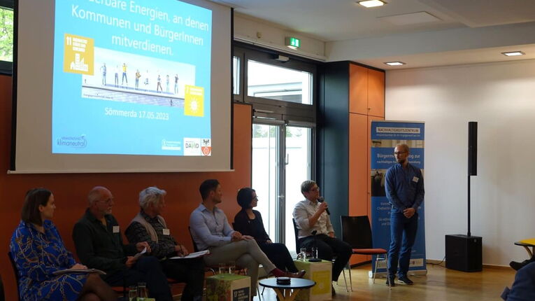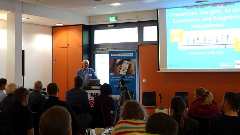 Das Nachhaltigkeitszentrum Thüringen lud im Mai zu seinem 1. Zukunftsforum im Jahr 2023 nach Sömmerda. Über 70 Teilnehmende waren dabei, zum Teil auch online zugeschaltet. Präsentiert wurden den Teilnehmenden gute Beispiele, wo Kommunen gemeinsam mit Bürgerinnen und Bürgern eigene Erneuerbare-Energien-Anlagen realisiert haben.