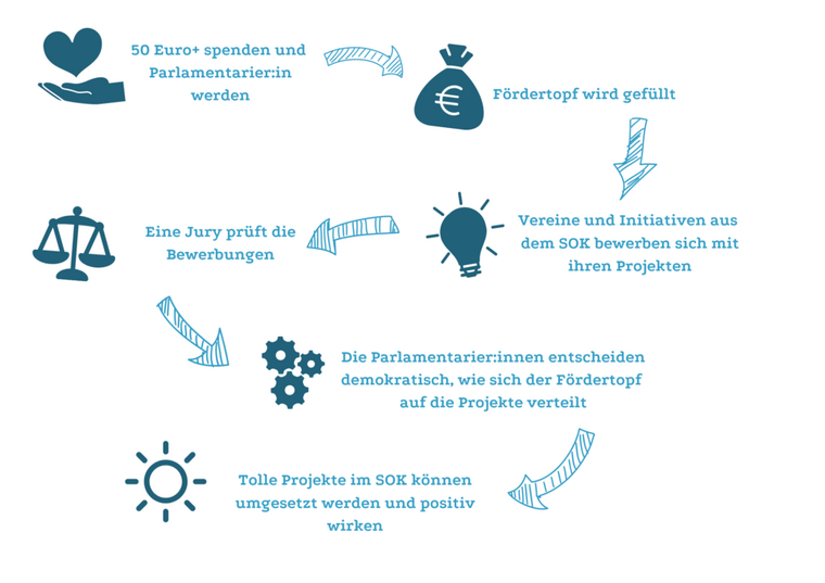 Das Spendenparlament bietet die Chance auf konkrete Mitbestimmung, welche Projekte aus dem SOK gefördert werden, die dann eine positive Wirkung im Landkreis entfalten bzw. verstärken. Der Fördertopf, der durch das Spendenparlament ausgeschüttet werden kann, wird durch Spenden gefüllt. Alle ab 14 Jahren können Mitglied im Spendenparlament werden. Für unter 18-Jährige ist die Teilnahme kostenlos.