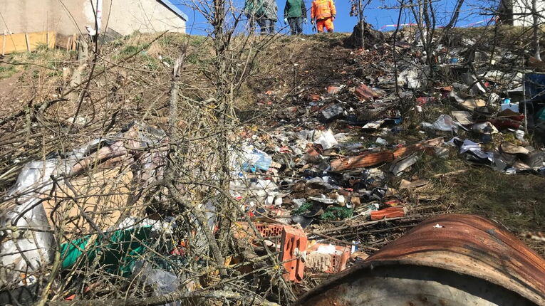 Wir hingegen waren am Dornheimer Berg aktiv. Dort hatte ein umweltbewusster Bürger beim Spaziergang mit seinem Hund massiven Mülleintrag zwischen Garagenkomplex und Bahnlinie entdeckt. Was für ein Aushängeschild für Arnstadt vor den Bahnreisenden! Der Ort erwies sich nämlich als illegale Müllkippe. Sofas und Sessel waren nur die Spitze des Dreckberges. Das Umweltamt im Ilm-Kreis schickte zwei Männer mit 3 Lademöglichkeiten. So waren wir schließlich 9 Personen. Auch der Kinder- und Jugendbeirat war wieder mit von der Partie. Und Privatpersonen, so u.a. der Mann, der den Müll beim Gassiführen entdeckt hatte. DANKE!