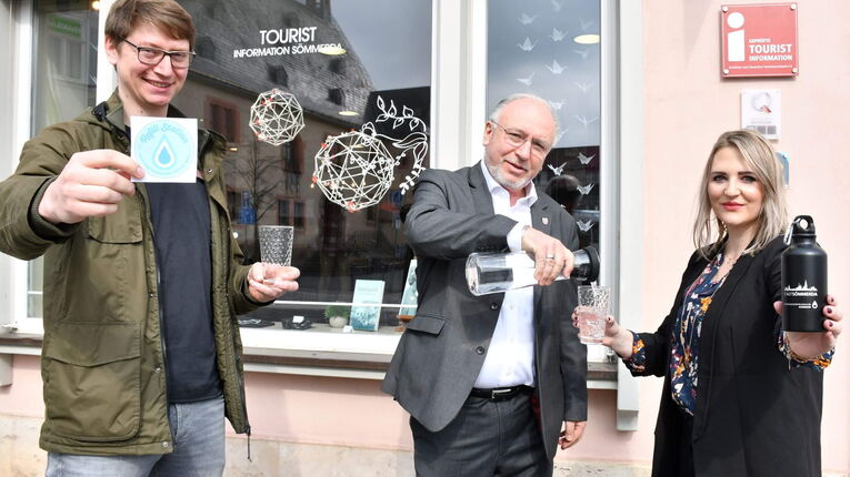Auch Ralf Uhlir (v. l.) von der Tourist-Information Sömmerda und Lena Kob, Wirtschaftsförderung/Stadtmarketing, freuen sich mit Bürgermeister Ralf Hauboldt über die erfolgte Zertifizierung als leitungswasserfreundliche Kommune © Stadtverwaltung Sömmerda